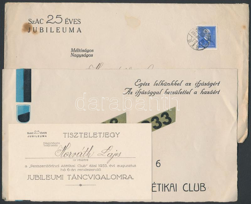 Beschreibung: 1933 A Pestszentlőrinci Atlétikai Club 25 éves jubileuma alkalmából, rendezett ünnepségre való meghívó, boríték és tiszteletjegy, 3 db