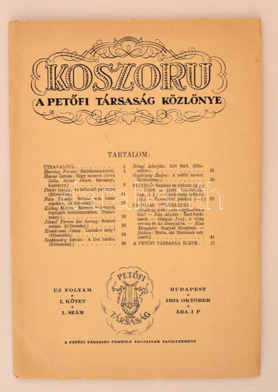 1934 Koszorú. A Petőfi Társaság Közlönye. I. kötet, 1 szám. Kiadói pap... https://www.darabanth.com/de/277-Fernauktion/277.0/Andere-Sammelgebiete/Drucksachen~28/1934-Koszoru-A-Petofi-Tarsasag-Kozlonye-I-kotet-1-szam-Kiadoi-papirkotes~II1419978