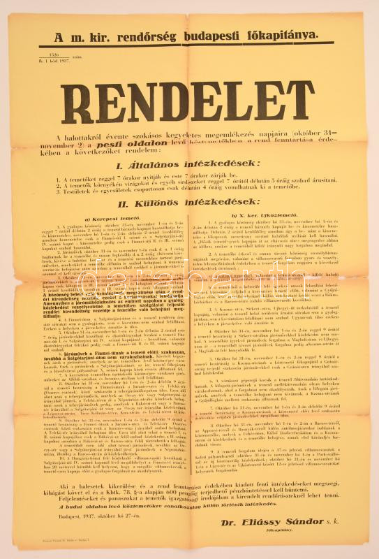 Beschreibung: 1937 A magyar királyi rendőrség rendelete Mindenszentek és Halottak napja idejére, nagyméretű plakát, a hajtások mentén szakadásokkal, 95×63,5 cm