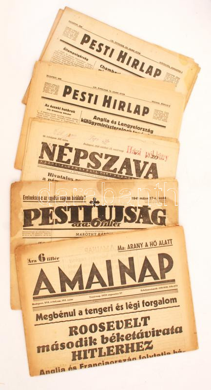 1939-40 Napilapszámok, háborús témájú cikkekkel. Összesen 5 db. https://www.darabanth.com/de/277-Fernauktion/277.0/Andere-Sammelgebiete/Drucksachen~28/1939-40-Napilapszamok-haborus-temaju-cikkekkel-Osszesen-5-db~II1261292