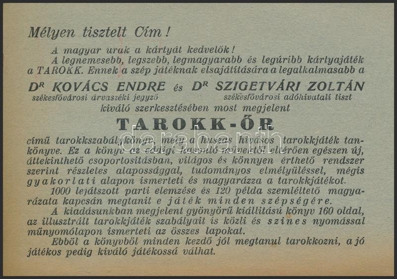 1940 Bp., Tarokk-őr, Tarokk-kártya szakkönyvet népszerűsítő levelezőla... https://www.darabanth.com/de/277-Fernauktion/277.0/Andere-Sammelgebiete/Drucksachen~28/1940-Bp-Tarokk-or-Tarokk-kartya-szakkonyvet-nepszerusito-levelezolap~II1418259