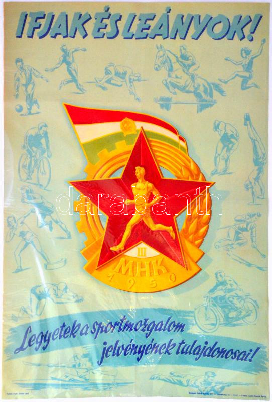 1950 MHK Ifjúsági Sportmozgalmi propaganda, offset plakát, ismeretlen művész. F.k. Balázs Jenő, Budapesti Szikra Nyomda. Hajtott, jó állapotban 84×58 cm