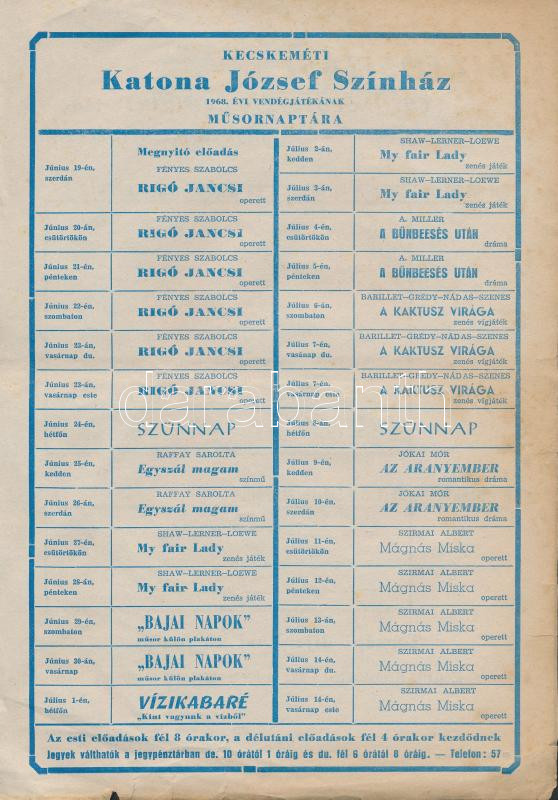Beschreibung: 1968 A kecskeméti Katona József Színház bajai (?) vendégjátékának műsornaptára