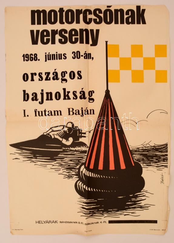 Beschreibung: 1968 Motorcsónak verseny, országos bajnokság I. futam Baján. F.k. Rózsavölgy Ferenc. Bánó Endre grafikus által tervezett offszet plakát, hajtva, sérült, 63×47 cm