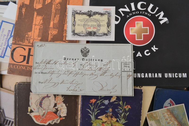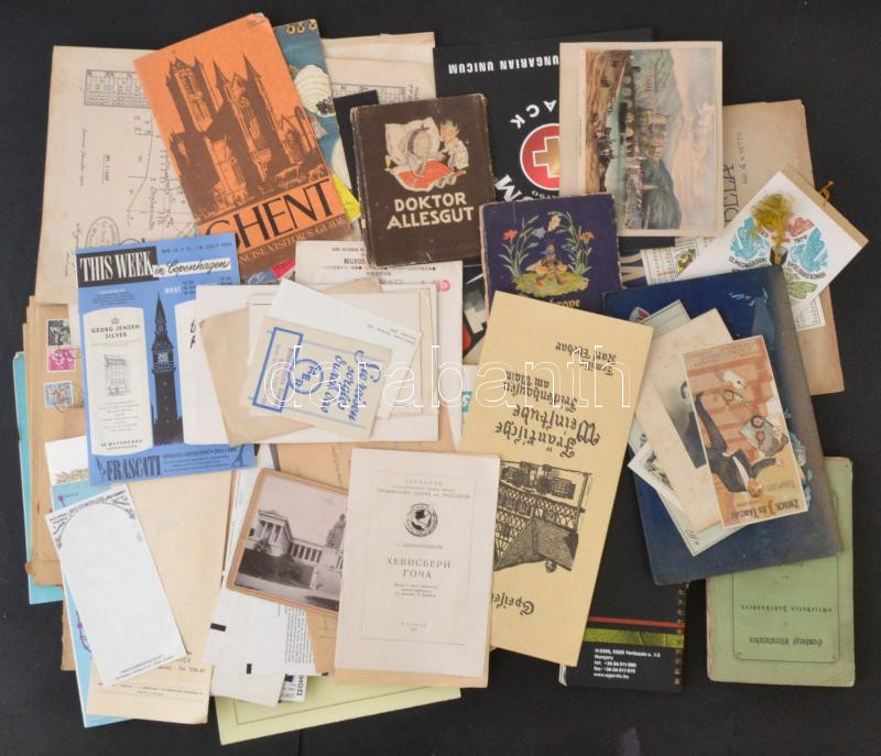 Beschreibung: Nagy vegyes papír hagyaték tétel, benne nyomtatványok, művészeti, okmányok, vegyesen