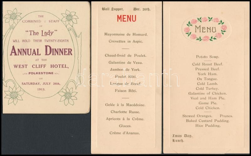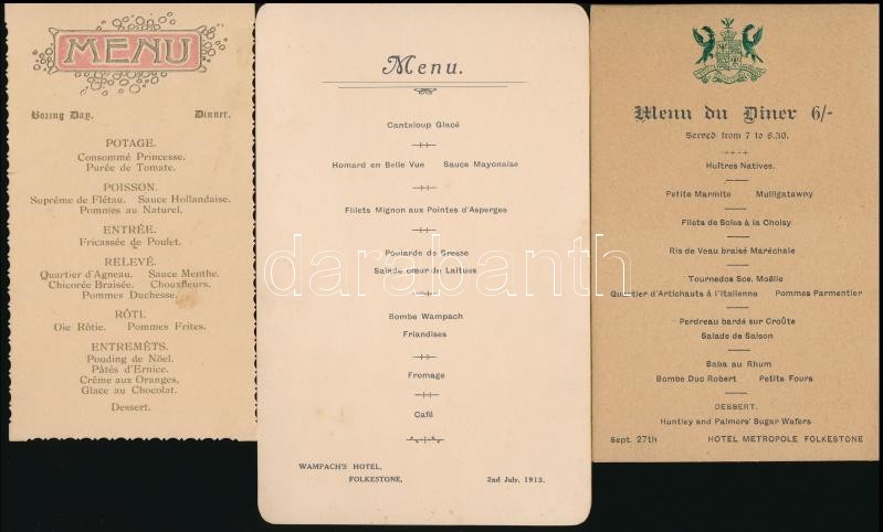 Beschreibung: cca 1900-1910 11 db menükártya, nagyrészt angol vacsorákra. Szép szecessziós darabokkal / 11 English, mainly art-nouveau menu cards