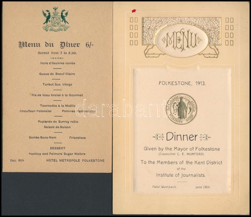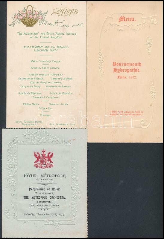 cca 1900-1910 11 db menükártya, nagyrészt angol vacsorákra. Szép szece... https://www.darabanth.com/de/277-Fernauktion/277.0/Andere-Sammelgebiete/Drucksachen~28/cca-1900-1910-11-db-menukartya-nagyreszt-angol-vacsorakra-Szep-szecesszios-darabokkal-11-E~II1420698
