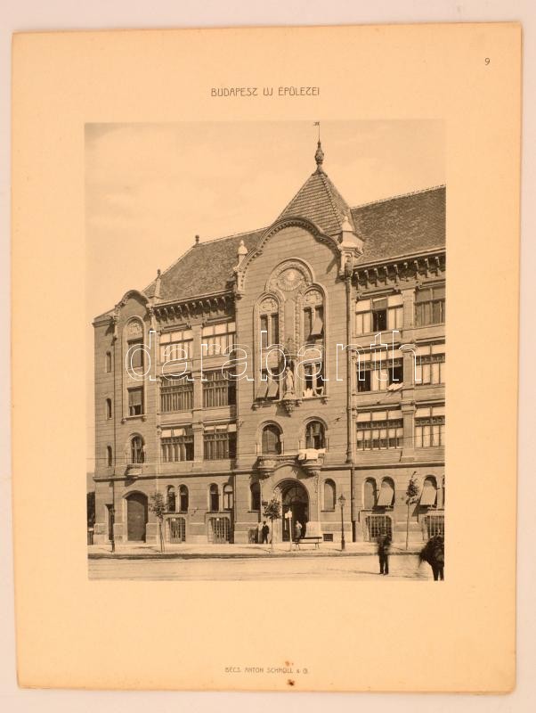 Beschreibung: cca 1900 a Budapest új épületei sorozat 5 darabja (Barabás-ház, Mátyás pince, stb.), Bécs, Anton Schroll, 40,5×31 cm