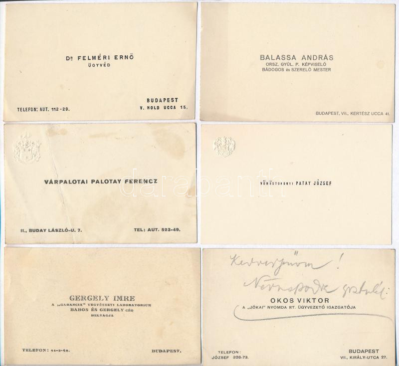 cca 1925-1930 Vegyes névjegykártya tétel(Dr. Felméri Ernő, Várpalotai ... https://www.darabanth.com/de/277-Fernauktion/277.0/Andere-Sammelgebiete/Drucksachen~28/cca-1925-1930-Vegyes-nevjegykartya-tetelDr-Felmeri-Erno-Varpalotai-Palotay-Ferenc-Okos-Vik~II1418315