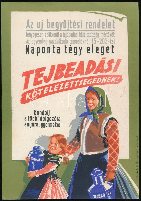 cca 1950 Naponta tégy eleget tejbeadási kötelezettségednek! Kisplakát.... https://www.darabanth.com/de/277-Fernauktion/277.0/Andere-Sammelgebiete/Drucksachen~28/cca-1950-Naponta-tegy-eleget-tejbeadasi-kotelezettsegednek-Kisplakat-15x22-cm~II1425437