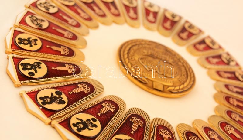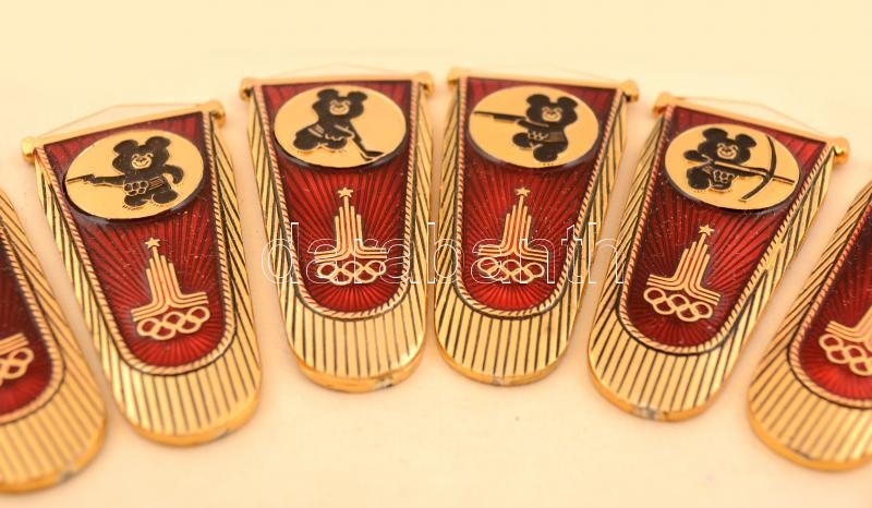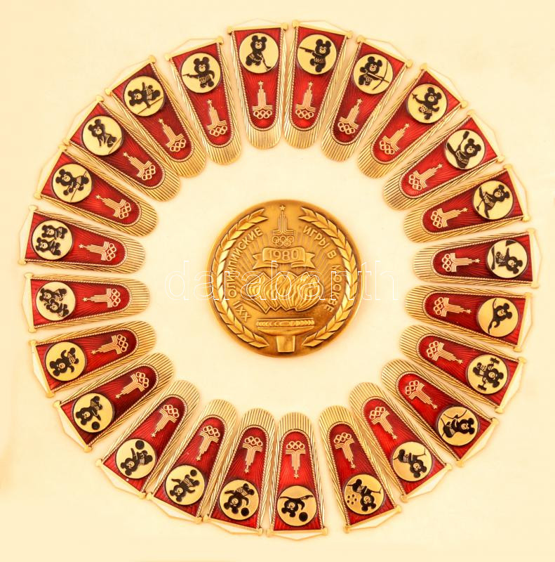 1980 XXII. Moszkvai Nyári Olimpiajátékok emlék zománc kitűzők (24 db), a sportágakat jelképző medve figurákkal, valamint egy nagy fém kitűző, karton lapon, karton dobozban, doboz: 26x26 cm., nagy fém kitűző: d: 7 cm., zománc kitűzők: 5.5 cm./ 1980 XXII. Moscow Summer Olimpics Games memorial enamelling pins (24 pc.), with sporting bear figures, and a big metal one, in carton, in carton box, box: 26x26 cm., big pin: d: 7 cm., enamelling pins: 5.5 cm.