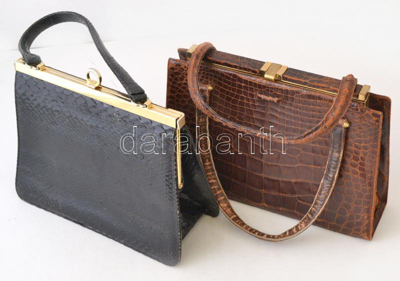 Beschreibung: 2 db dekoratív női kígyóbőr táska, barna és fekete színben, a barna kopottasabb állapotban, 26x22x10 cm