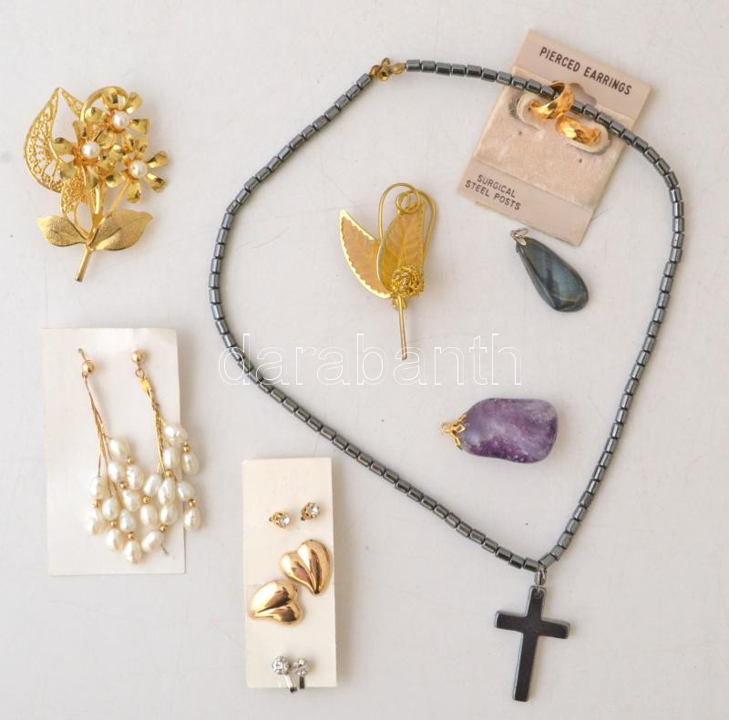 Beschreibung: Arany színű bizsu tétel, strasszokkal, gyöngyökkel, 7 db (fülbevalók, brossok) + Hematit nyaklánc ametiszt és tigrisszem medállal, 3 db
