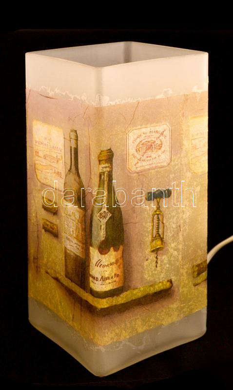 Beschreibung: Asztali opálüveg lámpa, borospalackos díszítéssel, működik, hibátlan, m:22 cm