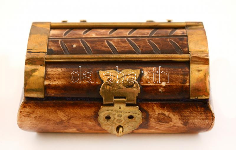 Beschreibung: Ékszeres dobozka, réz veretekkel, plüss belsővel, 7×4,5 cm