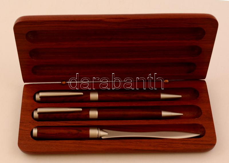 Beschreibung: Írószer készlet: toll, töltőceruza, papírvágó kés, tokban, jó állapotban