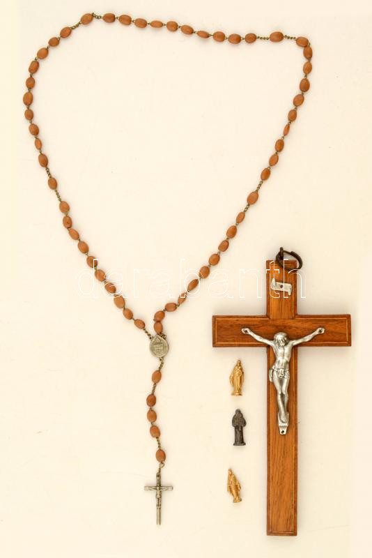 Beschreibung: Kegytárgyak: feszület, rózsafüzér, 3 db mini szent figura, m:3-20 cm, összesen 5 db