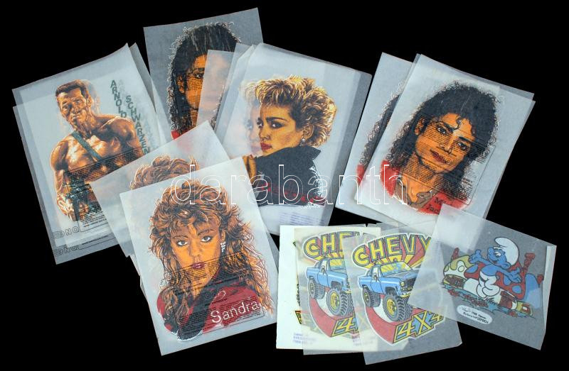 Beschreibung: Különféle pólóra vasalható matricák (Jackson, Sandra, Schwarzenegger), összesen 39 db + 17 db csík