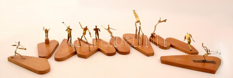Beschreibung: Sportolók, réz lapból készült figurák, fa talapzaton, 10 db, m: 10 cm