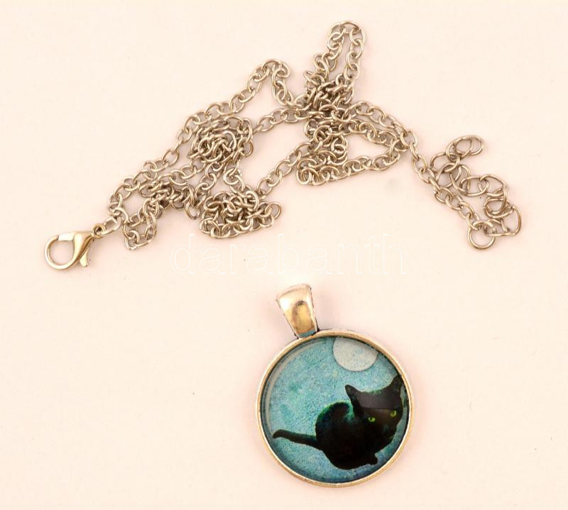 Beschreibung: Üveglencsés cicás medál láncon, h: 46 cm