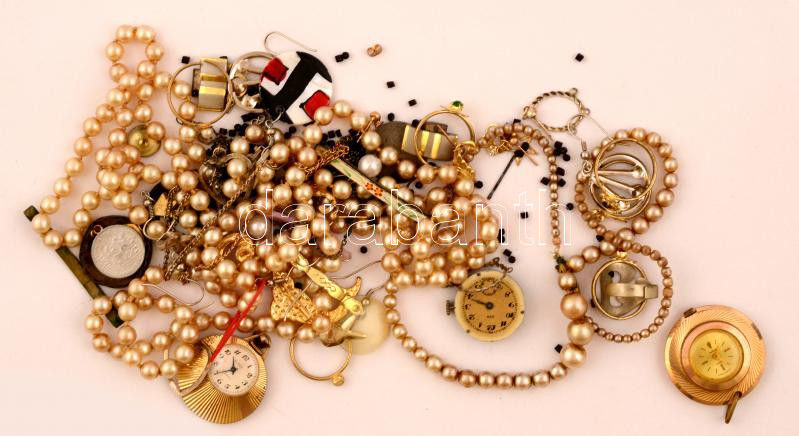 Beschreibung: Vegyes bizsu tétel, gyöngynyakláncokkal, gyűrűkkel, klipszekkel, gombórával, stb.