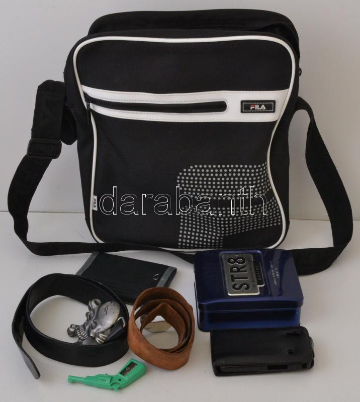 Vegyes bolha tétel: pisztoly alakú ceruzafaragó, 2 db bőr öv, mobiltelefontartó, pénztárca, francia kártya, FILA oldaltáska, STR8 fém doboz, benne két halálfejes őv és pénztárca