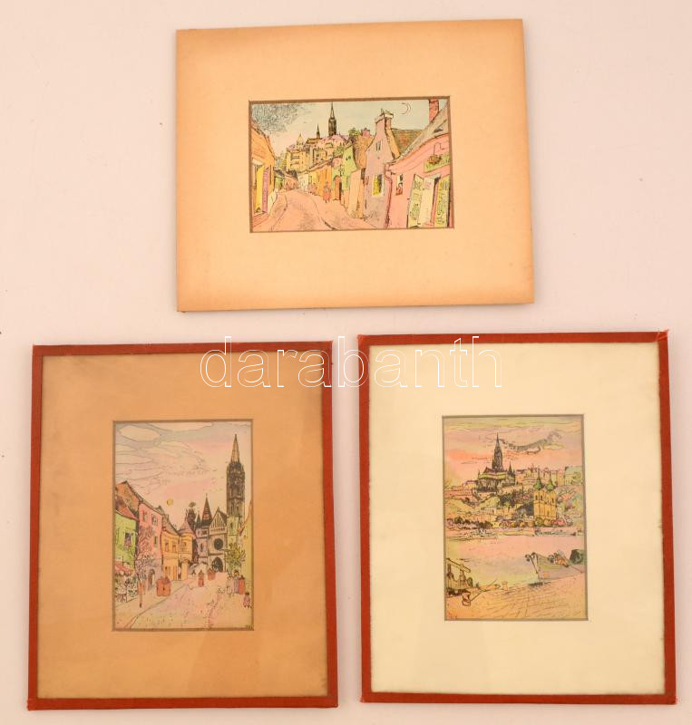 Beschreibung: cca 1930 Budapest, a Viziváros és más részek. 3 db Vadász Endre rajz nyomata, részben üvegezve. 20x25 cm