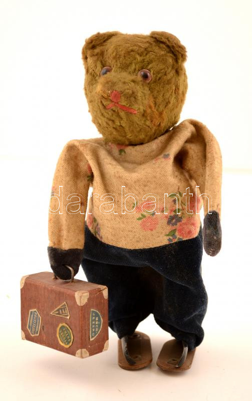 Beschreibung: cca 1930 Fémvázas játékmaci, kis kofferrel a kezében, m: 20 cm