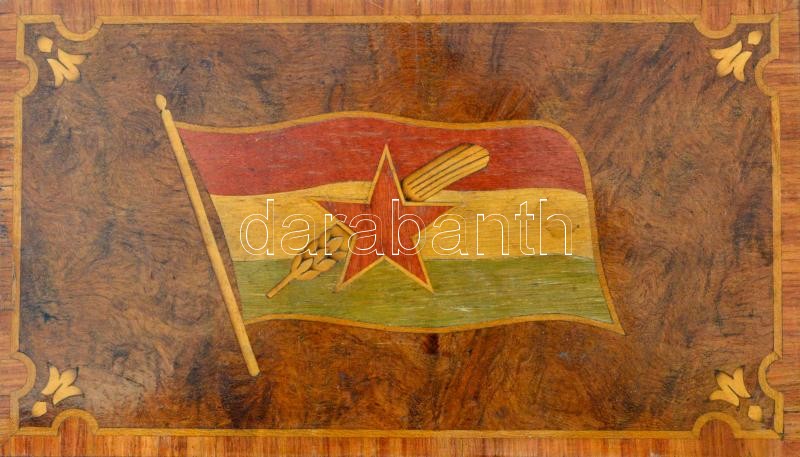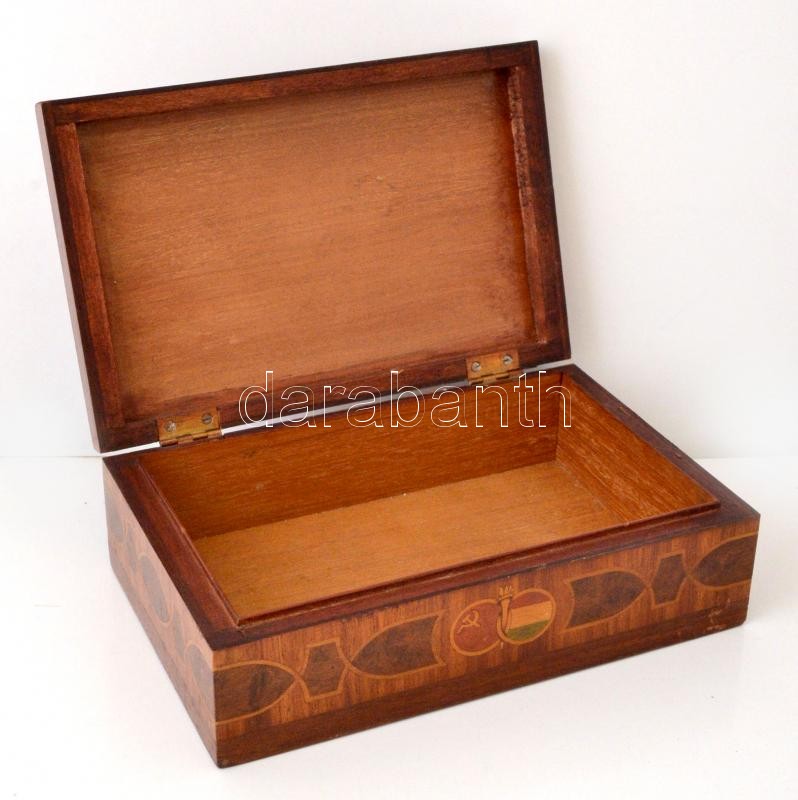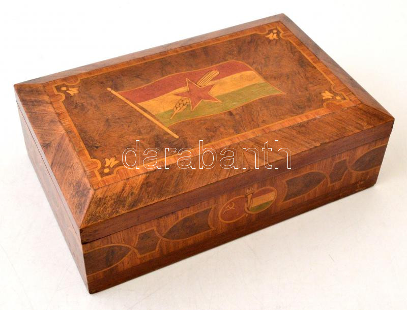 cca 1950 Szovjet-magyar címerrel díszített intarziás fa doboz, 21,5×14... https://www.darabanth.com/de/277-Fernauktion/277.0/Andere-Sammelgebiete/Flohmarkt~35/cca-1950-Szovjet-magyar-cimerrel-diszitett-intarzias-fa-doboz-21-5C39714C3977-5-cm~II1424396