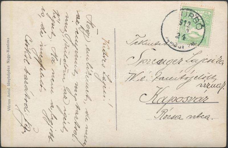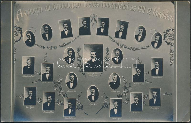 1912 Csurgó, Állami Tanítóképző végzős növendékei, kistabló 24 nevesített portréval, Vértes Antal nagykanizsai fényképész munkája, privát levelezőlapként megírva és postázva (ami tablóképek esetén igen ritka!), 9x14 cm