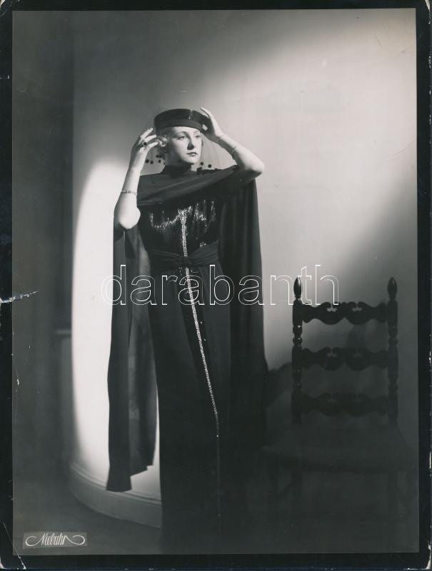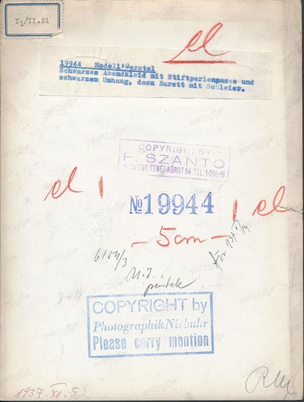 1937 Fekete estélyi ruha, női divatfotó a Photographik Niebuhr műteremből, hátoldalon a Szántó F. Műszaki és Sajtófotó Iroda pecsétjével, szakadással, 24×18 cm