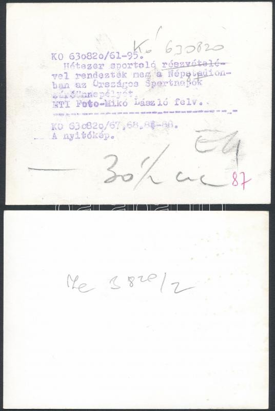 Beschreibung: 1963 Budapest, Népstadion, Az Országos Sportnapok záróünnepélye, 2 db MTI sajtófotó, hátoldalon feliratozva, 9x12 cm