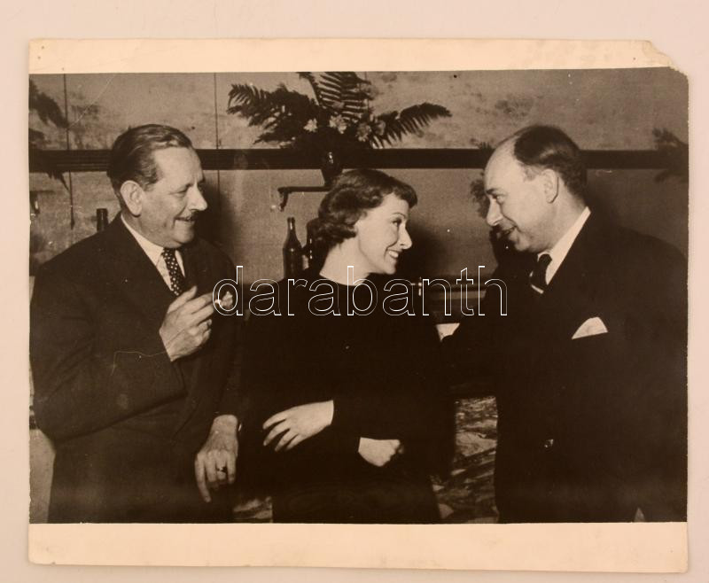 Juan Gyenes, Gyenes János (1912-1995) fotóművész nagyméretű fotója Muráti Lili (1912-2003) színművésznőről és férjéről Vaszary Jánosról (1899-1963), valamint egy ismeretlen személyről, az egyik sarka sérült, 24x30 cm. / Juan Gyenes (1912-1995): Photo of Lili Murati Hungarian/Spanish actress, and her husband János Vaszary, with an unknown man, one corner is damaged, 24x30 cm.