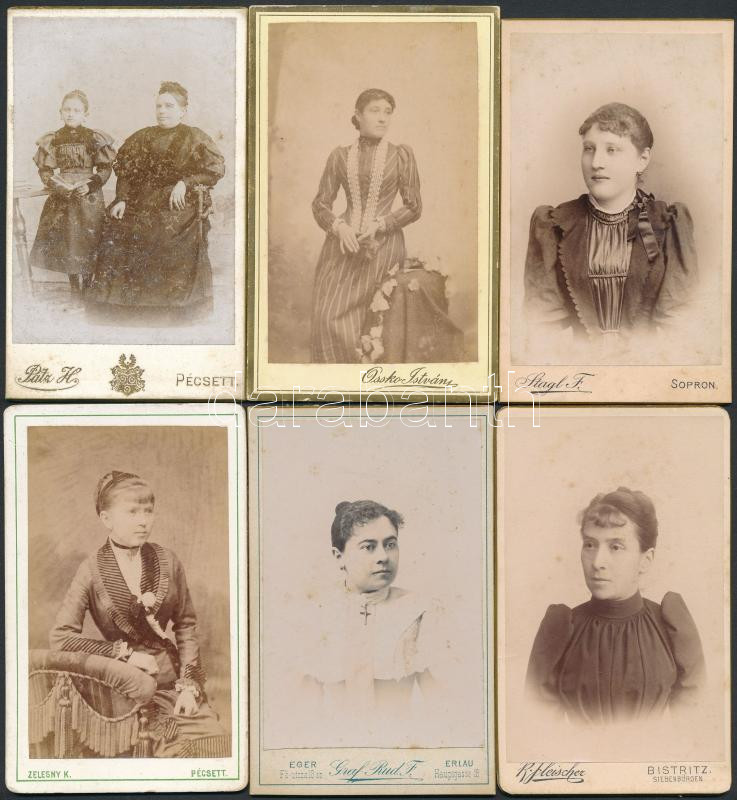 Beschreibung: cca 1880-1910 Hölgyportrék, 10 db portréfotó különböző műtermekből(Pécs, Komárom, Devecser, Beszterce, Eger, stb.), 10x6 cm