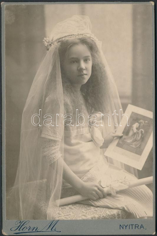 cca 1900 Kislány elsőáldozási portréja, keményhátú fotó Horn Mór nyitr... https://www.darabanth.com/de/277-Fernauktion/277.0/Andere-Sammelgebiete/Foto~19/cca-1900-Kislany-elsoaldozasi-portreja-kemenyhatu-foto-Horn-Mor-nyitrai-mutermebol-16~II1421824