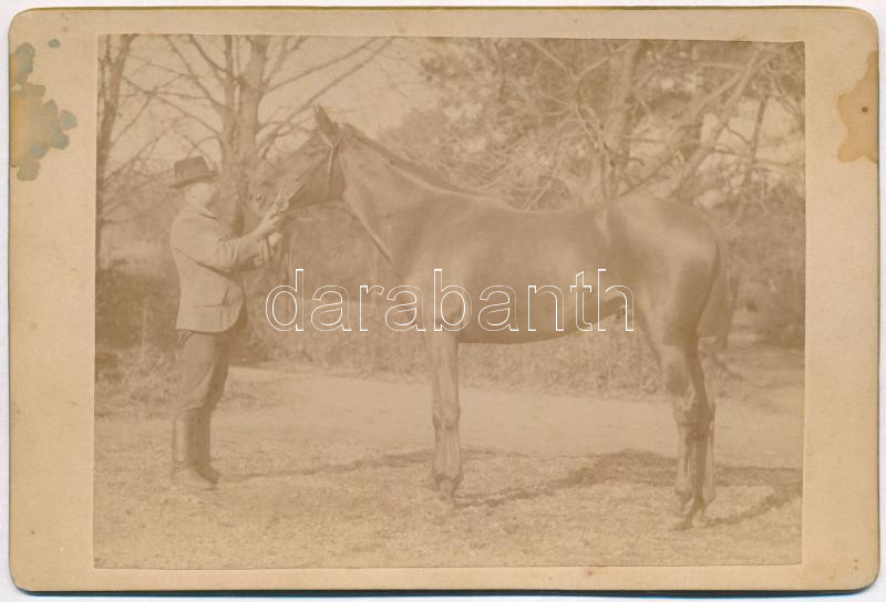 Beschreibung: cca 1900 Ló és gazdája, keményhátú fotó, karton foltos, 11x16 cm