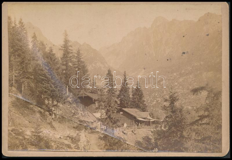 cca 1900 Tátra, Róza menház a Nagy-Tarpataki-völgyben, Rosa-Schutzhaus im Grosskolbacher Thale. Keményhátú fotó Divald Károly műterméből, sérült, 11×16 cm