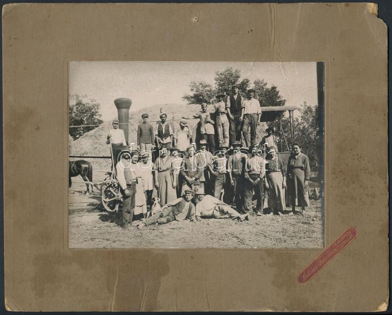 Beschreibung: cca 1910 Szilasbalhás, Mezőgazdasági munkások cséplőgép előtt, kartonra kasírozott fotó Lukács Ferenc műterméből, 12x17 cm