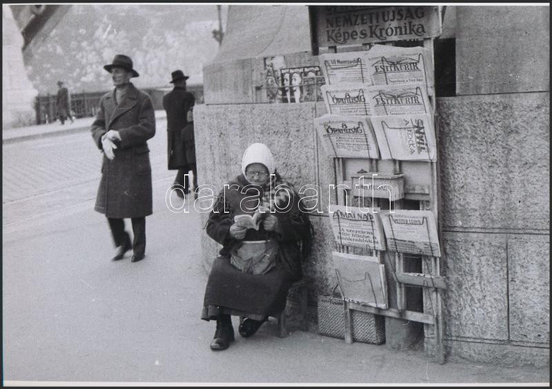 Beschreibung: cca 1930 Budapest, újságárus az Erzsébet híd budai hídfőjénél, korabeli negatívról készült mai nagyítás, 18x25 cm