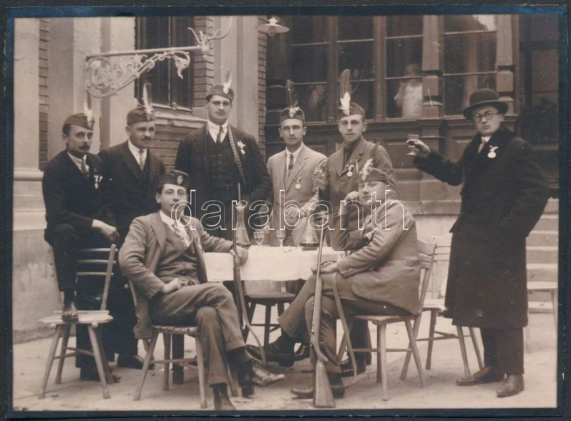cca 1930 Levente asztaltársaság, kitüntetésekkel és puskákkal, 8x11 cm https://www.darabanth.com/de/277-Fernauktion/277.0/Andere-Sammelgebiete/Foto~19/cca-1930-Levente-asztaltarsasag-kituntetesekkel-es-puskakkal-8x11-cm~II1417771
