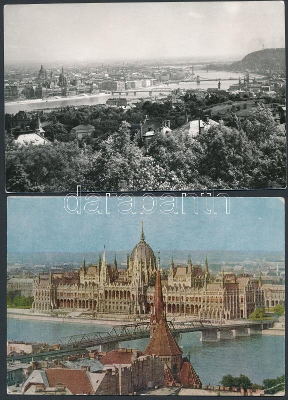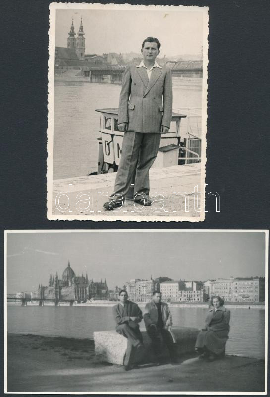 Beschreibung: cca 1946-1953 Budapest, Duna-part, háttérben a Kossuth híd, 2 db fotó, hátuljukon feliratozva + 2 db fotólap, különböző méretben