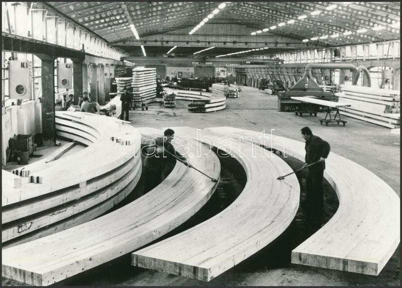 cca 1979 Agárd, az Agrokomplex üzemében fából készült építőelemeket készítenek raktárak, uszodák, és más könnyűszerkezetes épületek részére, 2 db vintage fotó, 17x23 cm