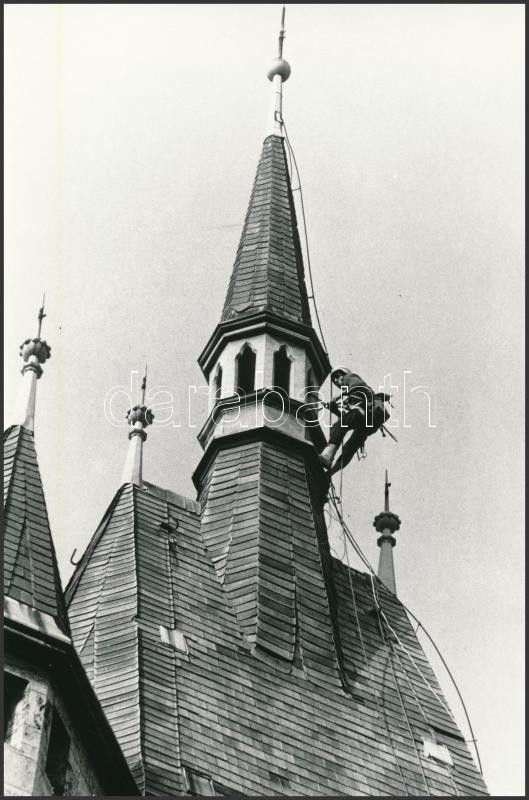 Beschreibung: cca 1980 Budapest, villámhárító csere a városligeti Vajdahunyad vár egyik tornyán, vintage fotó,23x15 cm