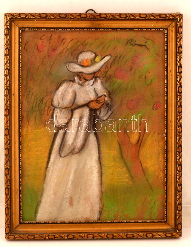 Beschreibung: Rónai jelzéssel: Kalapos asszony. Pasztell, papír, üvegezett kertben, 37×24 cm