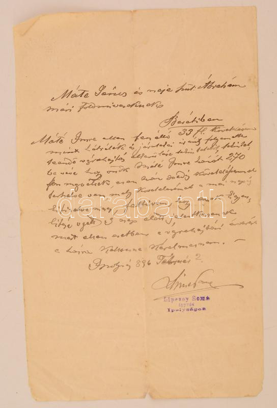 1896 Lipcsey Soma ipolysági ügyvéd levele Barátiba szárazpecsétes levélpapíron