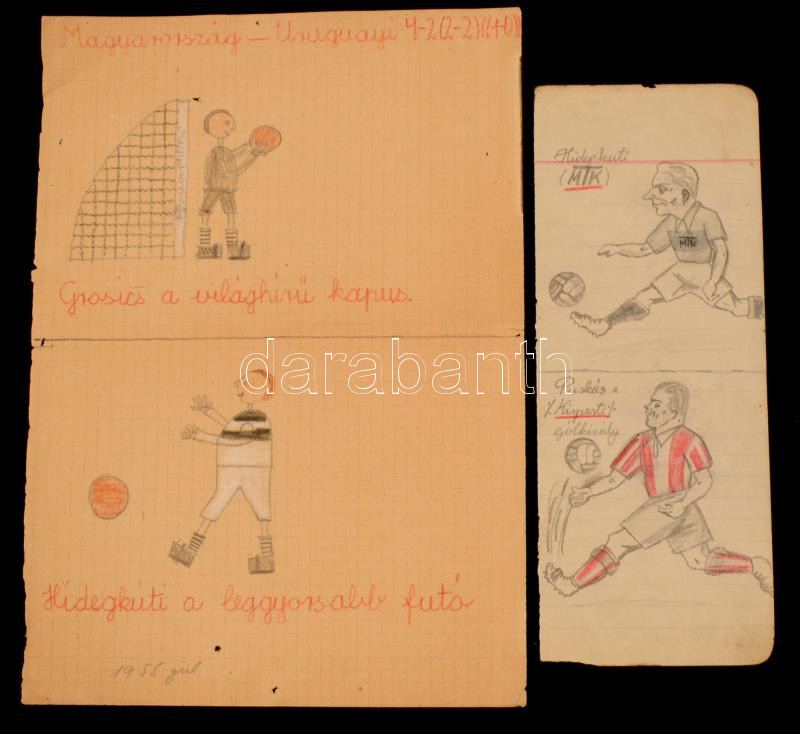 cca 1955 Jelzés nélkül: 4 db gyerekrajz az Aranycsapat játékosairól, vegyes technika, papír, különböző méretben