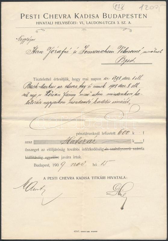1909 Bp., A Pesti Chevra Kadisa által kiállított számla, mindenkori ha... https://www.darabanth.com/de/277-Fernauktion/277.0/Andere-Sammelgebiete/Judaica~24/1909-Bp-A-Pesti-Chevra-Kadisa-altal-kiallitott-szamla-mindenkori-halalozasi-napjain-elmondo~II1418971