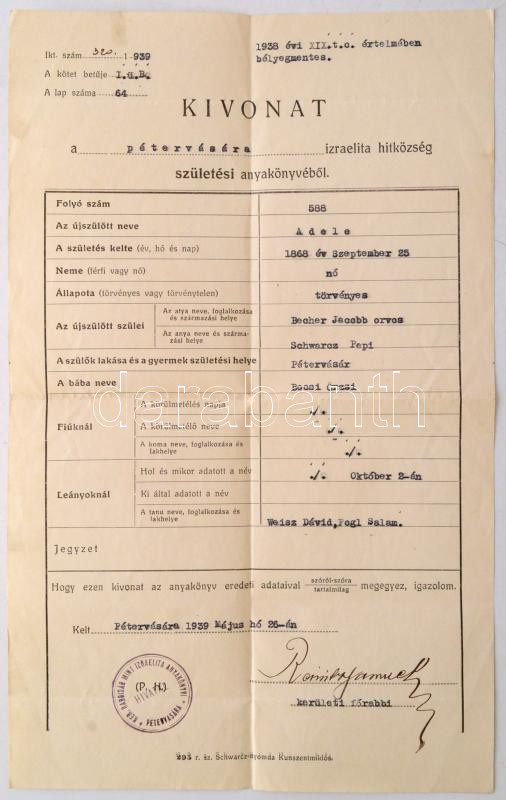 1939 Pétervására, a kerületi rabbiság által kiadott kivonat korábbi születési anyakönyvből a főrabbbi aláírásával és pecsétjével, hajtva / certificate of birth registration issued by Hungarian local rabbi