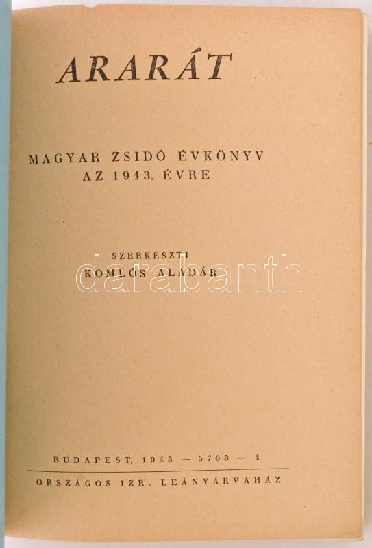 1943 Ararát. Szerkesztette Komlós Aladár. Magyar Zsidó Évkönyv. Budape... https://www.darabanth.com/de/277-Fernauktion/277.0/Andere-Sammelgebiete/Judaica~24/1943-Ararat-Szerkesztette-Komlos-Aladar-Magyar-Zsido-Evkonyv-Budapest-Orszagos-Izraelita-L~II1404253