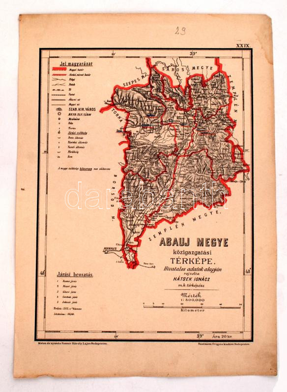1880 Abauj megye közigazgatási térképe. Hátsek Ignác - A magyar szent korona országainak megyei térképei. Rajzolta Hátsek Ignácz. Budapest, 1880. Rautmann Frigyes Kiadó Hivatala Posner Károly Lajos. Határszínezett kőnyomat,kis hibával a széleken, 38x27cm